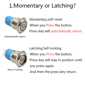 For This Latching Self-locking push button, when you press it, Press-key will stay in position until you press again. And then the press-key return.