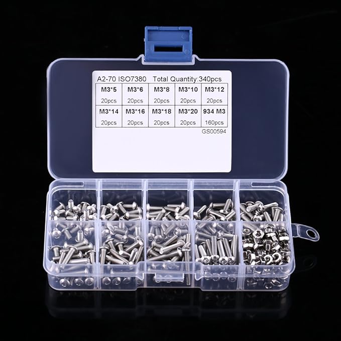 Package Include: M3*5 x 20pcs Screws M3* 6 x 20pcs Screws M3* 8 x 20pcs Screws M3*10 x 20pcs Screws M3*12 x 20pcs Screws M3*14 x 20pcs Screws M3*16 x 20pcs Screws M3*18 x 20pcs Screws M3*20 x 20pcs Screws M3 x 160pcs Hex Nuts