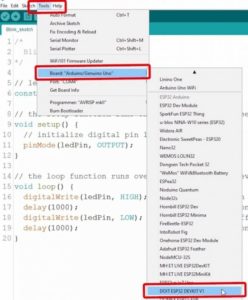 1. Go to Tools > Board, scroll down to the ESP32 section and select the name of your ESP32 board. In my case, it’s the DOIT ESP32 DEVKIT V1 board.