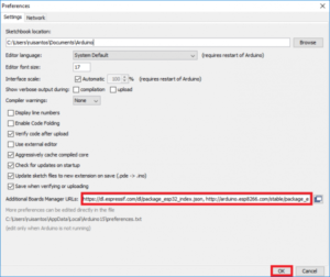 Step2: Enter https://dl.espressif.com/dl/package_esp32_index.json into the “Additional Board Manager URLs” field as shown in the figure below. Then, click the “OK” button: